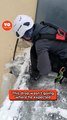 Winter clean-up might seem simple until gravity introduces its own timing. A climber on the side of a structure tries to dislodge a long icicle and successfully breaks it loose. The ice shard falls past the building's surface, heading towards the windows underneath, where it collides with a pane during its descent. This serves as a swift reminder that even a well-planned ice removal can become unpredictable with a single drop. The clip concludes with the building's exterior bracing for the impact.