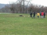 Un commissaire tourne un panneau qui indique au mettre quelle position berlioz doit effectuer <br />Le chien ne doit pas avancer.