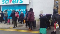 Customers queue round corner of UK shop where toilet roll is limited to two packs per person