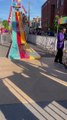 Cet homme descend le toboggan d'une drôle de façon.