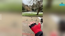Man Covered in Pigeons as Dozens Land on Him in Park