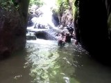 les gars s'entraînent pour passer le sac de l'appareil photo sans le mouiller.