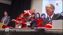 Après l'annonce d'un retard de plus d'un an dans la livraison de l'A380. La somme 5 milliards de surcoût, qui devrait être compensée par un plan de redressement fait craindre en France et en Allemagne une série de licenciements.- Commentaire sur images d'illustration et d'archives expliquant la situation difficile causée par les retards de livraison.- Interview de Daniel LEBRIS , CGT EADS. Il s'oppose à toute suppression et demande aux actionnaires d'endosser les surcoûts.- Interview de Louis GALLOIS, co-président d'EADS. Il explique que toute la chaîne de production va être réétudiée en dialogue avec l'ensemble des partenaires concernés.- Interview de Julien TALAVAN, Secrétaire Général FO. - Interview d'Aline DOYEN, présidente SOMEPIC Technologie. Les petites filiales se retrouvent en concurrence directe avec les pays en voie de développement.<br /><br /><a href="http://www.ina.fr///video/3188939001001/le-point-sur-le-plan-de-restructuration-d-airbus.fr.html#xtor=AL-3" target="_blank" style="color:#0086b0;">Retrouvez ce media sur Ina.fr</a>