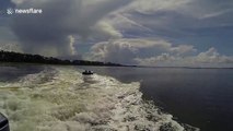 Dolphins frolic in boat's Wake