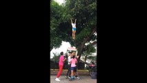 Cheerleading squad tosses friend into air to retrieve tasty mangoes