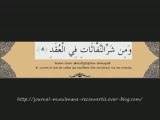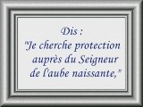 1- Dis: "Je cherche protection auprès du Seigneur de l'aube naissante,<br /><br />2- contre le mal des êtres qu'Il a créés,<br /><br />3- contre le mal de l'obscurité quand elle s'approfondit,<br /><br />4- contre le mal de celles qui soufflent (les sorcières) sur les noeuds,<br /><br />5- et contre le mal de l'envieux quand il envie".