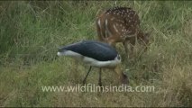 "Adjutant Stork and Chital in Bandhavgarh grassland, January 2011. Animals in Bandhavgarh National Park. Spotted deer or Cheetal. The chital's coat is reddish fawn, marked with white spots, and its underparts are white. Its antlers, which it sheds annually, are usually three-pronged and curve in a lyre shape and may extend to 75 cm (2.5 ft). Chital are grazers and feed on short, sprouting grasses. Chital also eat their shed antlers as a source of nutrients and will use mineral licks. This footage is part of the professionally-shot stock footage archive of Wilderness Films India Ltd., the largest collection of imagery from South Asia. The Wilderness Films India collection comprises of thousands of hours of high quality broadcast imagery, mostly shot on HDCAM 1080i High Definition, HDV and Digital Betacam. Write to us for licensing this footage on a broadcast format, for use in your production! We pride ourselves in bringing the best of India and South Asia to the world... wfi @ vsnl.com and admin@wildfilmsindia.com.<br />"