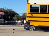 Auto kracht in Schulbus und bleibt darunter stecken