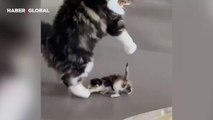 Yavrusunun ilk adımını gören anne kedinin sevinci viral oldu
