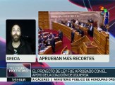 Trabajadores, pensionados y estudiantes griegos protestan este sábado frente a la sede del Parlamento en protesta por los recortes gubernamentales. teleSUR