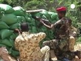 Un soldat ougandais abrité derrière un mur de sacs de sable observe, à travers une meurtrière équipée d'une mitrailleuse, la route vide et silencieuse qui marque, à Mogadiscio, la dangereuse ligne de front avec les insurgés islamistes somaliens. Durée: 02:25