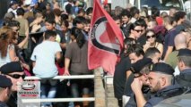 Roma. All'incrocio tra via manzoni e via merulana scontri tra polizia e frange violente del corteo. La celere, giunta per alleggerire i blocchi di manifestanti che si facevano scudo di cassonetti incendiati, hanno dovuto arretrare per il lancio di bottiglie, sassi e fumogeni. Solo l'arrivo di due blindati a forte velocità è riuscito a disperdere i manifestanti. Servizio di Fabio Butera.
