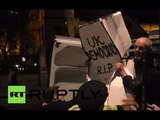 Several Occupy DC protesters were arrested in Washington after confrontations with police in a park just blocks form the White House.<br/> Demonstrators chanted "We are the 99 percent" as officers handcuffed them. The conflict in D.C. centers around this wooden structure --- which went up overnight without a permit.<br/> Police gave demonstrators an hour to take down what protesters are calling "a symbol of foreclosed homes."<br/> When they refused, police moved in.<br/> The arrests on Sunday ended weeks of relative calm for the anti-Wall Street demonstration in Washington.<br/> Deborah Gembara, Reuters