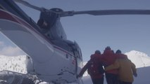 Group Approaches Helicopter in Snowy Landscape