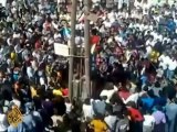 Fires rage in Homs.<br/> <br />Amateur video out of Syria appears to show flames rising from a house.<br/> <br />The video, which could not be independently verified by Reuters also shows a refinery on fire.<br/> <br />On Wednesday Syrian forces pushed into Homs killing as many as 100 people according to activists.<br/> <br />Syrian state television is blaming quote "terrorists" of targeting the refinery.<br/> <br />More footage, purportedly from Idlib shows Syrian forces on the street.<br/> <br />The UN says more than 5,00 people have been killed in Syria since the uprising began last March.<br/> <br />On Tuesday the Russia said it won a promise from President Bashar al-Assad to end to bloodshed. Now Russia is calling for dialogue<br/> <br />In Idlib a funeral service. The crowds chant death not humiliation.<br/> <br />Syria's State news agency says that funerals were held Tuesday for 30 members if its security forces.<br/> <br />On Wednesday a Turkish newspaper close to the government said Turkey, which has taken a strong stand against former ally Assad, is planning to organize a conference with Arab and Western governments in Istanbul.<br/> <br />Deborah Lutterbeck, Reuters