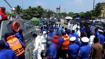 A U.S. Coast guard helicopter hovers over the Farallon Islands in the Pacific Ocean, 45 miles west of San Francisco, California.<br/> <br />Rescuers are lowered down to retrieve two stranded sailors, after a strong wave smashed into their boat, sweeping four crew members overboard.<br/> <br />One of the sailors was killed in the accident.<br/> <br />The eight-member crew was aboard the 38-foot yacht named "Low Speed Chase" as part of a race around the group of islands when the massive wave struck.<br/> <br />The U.S. Air National Guard also saved a third crew member in a separate rescue mission.<br/> <br />Travis Brecher, Reuters