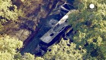 The twisted remains of a tour bus and truck collision that killed at least 43 in Veracruz, Mexico.<br/> <br />Authorities say the bus was hit by a truck after its trailer somehow became decoupled, as the vehicles passed in opposite directions on Friday morning.<br/> <br />Another truck then crashed into the bus, investigators said.<br/> <br />(SOUNDBITE) (Spanish) TUXPAN MAYOR, SALOMON CARMONA, SAYING:<br/> <br />"Unfortunately this is a tragic accident. A truck with a double cargo trailer decoupled and the driver tried to manoeuvre to miss the bus."<br/> <br />The bus was transporting workers north, likely to factories along the U.S.-Mexico border.<br/> <br />Officials are also arranging transportation for relatives to be with the survivors, including three teens in serious condition, as well as identify the bodies of loved ones.<br/> <br />Jessica Gray, Reuters