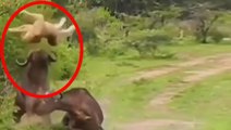 Ormanın kralı Aslanın en çaresiz anı! Gözü dönen bufalo rakibini yerden yere vurdu