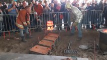 Comme tous les ans, les empreintes des mains des vainqueurs de la dernière édition des 24 heures du Mans rejoindront celles de leurs prestigieux prédécesseurs, lors d’une cérémonie rituelle organisée et financée par la Ville du Mans et la Chambre de Commerce. Mais avant la fête, l’heure était à la sueur. C’est dans un atelier de la fonderie d’art Macheret, entreprise installée en zone artisanale de la Pécardière à Montfort-le-Gesnois, que l’opération s’est déroulée dans l’après midi. Pas moins de 90 kilogrammes de bronze en fusion ont été coulés après avoir été chauffés à 1 150 degrés. En fusion, le bronze s’est écoulé lentement, gorgeant de sa lave le moule qui lui était réservé, gravé du sceau de l’édition 2 011.