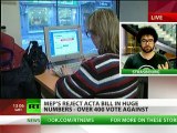 Mercredi 4 juillet, le Vote ACTA tombe enfin... <br />Avec 478 votes contre le traité anti-contrefaçon, le traité tombe...<br />"Bye Bye ACTA, Welcome Democracy !".<br />Fer de lance politique contre ce traité anti démocratique, les députés européens Verts savourent cette belle victoire.