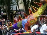 http://www.boutiquemexicaine.com - Alebrijes 2012 - Mexico Mexique Extrait 7 <br />Un alebrije est une figure fantastique et mythique, par exemple : un coq avec des jambes chien, tête de vache et des ailes de chauve-souris, des monstres et des fees, faits avec du carton, papier, bristol, pâte et peinture. Il y avait d'autres alebrijes comme le Gallobrije, confectionné avec concret, tige et carreau, dont l'élaboration a tardé deux mois et qui pèse presque 300 kilos. <br /><br />Le défilé a commencé a 18:00 heures. Son départ a eu lieu aux installations du Musée d'Art Populaire (MAP), dans la rue de Revillagigedo et, peu à peu, il a avancé par les avenues Juárez et Madero, jusqu'au Zocalo du DF
