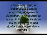 Cheikh 'Abdur-Razzaq al-' Abbad:<br />Et là, je me rappelle quelque chose de nouveau qui a eu <br />lieu ... et c'était il ya vingt ans, je tenus(des cours où j') ai <br />expliqué les quarante (Hadith de l'Imam An-Nawawi) <br />dans l'un des masaajid.Et je l'ai fait sous forme <br />d'excercice à l'asemblée dans la mosquée pour qu'ils <br />mémorisent les quarantes (Hadiths).<br />Alors, un homme est venu et a rejoint le cours après que <br />j'ai expliqué sept hadith, et il a dit: je veux participer <br />avec vous.J'ai dit: A condition que vous mémorisez les <br />sept hadith précédent.<br />Alors, il les a mémorisé avec précision et nous a rejoint <br />dans le cours. Et nous avons continué chaque jour avec <br />un hadith, je les laissais entendre (le hadith), puis <br />je le leur expliquais. <br />(Nous avons continué de cette manière) jusqu'à ce que <br />(ce) que nous approchions de la fin. (Je souligne ici que) <br />cet homme était un ouvrier célibataire qui vivait avec <br />d'autres travailleurs<br />(Alors) quand on approcha de la fin, sur mon chemin de <br />la mosquée, il m'a rattrapé et m'a dit: <br />"Je voudrais vous dire quelque chose"<br />J'ai dit: "S'il vous plaît (allez y)<br />Il a dit: «Par Allah, je sens que je suis maintenant un <br />savant!"<br />Je lui ai dit: «Pourquoi (comment donc)?"<br />Il m'a dit: "(Avec) tous les travailleurs célibataires d'entre <br />nous, chaque fois qu'ils se trompent, je leur réponds avec <br />un hadith, je mentionne le narrateur (du hadith) et je leur<br />mentionne aussi le transmetteur (du hadith) - en <br />ce qui concerne tout ce sur quoi ils se trompent <br />Alors je lui ai dit: «Certes, ce que vous avez atteint <br />comme science, est alors considéré comme le début de <br />la (recherche) de la science, les bases et les clefs pour <br />(chercher plus loin) la science.<br />La science est un chemin qui nécessite de la patience de <br />votre part, et (qui vous) change (selon la science acquise), <br />et (qui vous maintient)engagé, et luttant<br />(sur cette noble voie). <br />Cependant, ce que vous avez atteint sont les principes de <br />base (dans la recherche de la science) et la parole<br />compréhensible du Messager salallahou aleyhi wa salam. <br />"<br />Ainsi, le point étant que ces quarantes (Hadith de l'Imam <br />An-Nawawi) sont en effet très importants, et il est digne <br />pour tout musulman qu'il (aussi) leur accorde le plus <br />grand soin et attention, (comment?):<br />Tout d'abord: Qu'il les memorise;<br />Deuxièmement: il encourage ses fils et ses filles et sa <br />femme à la maison afin de les mémoriser.<br /><br />islam coran Quran koran sunna sounna souna sunnah prophète prophet salafis salafiste salafisme abbad badr wasabi sourate califat jihad ALLAH mohamed kitab minhaj sunna salafs salih ahmad musulman sunnite chiite wahabi soufi tabligh takfiris khawarij tawhid koufr chirk mécréant gouverneur paix religion calife abou bakr omar othman ali rafidhi salat zakat ramadan hajj prière aumône france arabie ahbaches ahmad hijab niqab sitar femme paradis enfer destin anges messagers