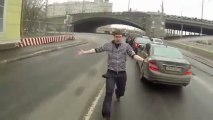 En Russie, ce motard ivre tente de s'arrêter à un feu rouge mais va bien avoir du mal à rester debout. Il va chuter et difficilement réussir à se relever...