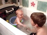 Bébés Jumeaux prennent leur bain, dans les bras l'un de l'autre. TROP MIGNON