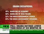 According to a leading national poll, after six months in office, Barack Obamas presidential approval rating is now lower than his predecessor George W. Bush at the same point in his White House tenure.