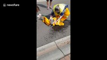 A koala which was injured in a massive bushfire in Australia was found with burnt paws and singed fur on Monday. Local resident Clint Woods spotted the ...