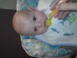 Premières cuillières données par Louis, tout fier !<br />Elle a presque 4 mois (moins 3 jours lol).<br />Elle a une mine fatiguée car elle a une bronchiolite.