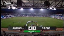 Partido correspondiente a la 22ª jornada de la Liga Adelante, jugado en la Nova Creu Alta ante 2.760 aficionados y bajo una intensa tormenta de lluvia.<br />Se enfrentaron el CE Sabadell y el Girona FC, con resultado final de 4-1 para el equipo local, goles de: 1-0, Moha m.27. 2-0, Antonio Hidalgo m.32. 3-0, Antonio Hidalgo m.50. 3-1, Luso m.51. 4-1, Lanza m.56.<br />El CE Sabadell lucio a su salida una camiseta con ánimos para Dani Tortolero recientemente operado de una hernia y Jesús Olmo , se ha guardado un minuto de silencio por la muerte del socio Pedro Barrachina Andreu.