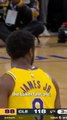 Un fan des Cavs entre sur le parquet pour montrer son T-shirt à LeBron James