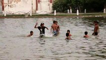 Boys take a dip to beat the extreme summer heat in Delhi. They take a dip in the waterways near the India Gate in New Delhi.<br /><br />The India Gate is the national monument of India. Situated in the heart of New Delhi, it was designed by Sir Edwin Lutyens.<br /><br />Built in 1931, the monument was inspired by the Arc de Triomphe in Paris, which in turn was inspired by the Roman Arch of Titus. Originally known as the All India War Memorial, it is a prominent landmark in Delhi and commemorates the 90,000 soldiers of the British Indian Army who lost their lives in World War I and the Third Anglo-Afghan War. It is composed of red and pale sandstone and granite.<br /><br />Originally, a statue of George V, Emperor of India stood under the now vacant canopy in front of the India Gate, but it was removed to Coronation Park together with a number of other British Raj-era statues. Following India's independence, the India Gate became the site of the Indian Army's Tomb of the Unknown Soldier, known as Amar Jawan Jyoti ("the flame of the immortal soldier").<br />Source: Wikipedia<br /><br />This footage is part of the professionally-shot broadcast stock footage archive of Wilderness Films India Ltd., the largest collection of HD imagery from South Asia. The Wilderness Films India collection comprises of tens of thousands of hours of high quality broadcast imagery, mostly shot on HDCAM 1080i High Definition, HDV and XDCAM. Write to us for licensing this footage on a broadcast format, for use in your production! We are happy to be commissioned to film for you or else provide you with broadcast crewing and production solutions across South Asia. We pride ourselves in bringing the best of India and South Asia to the world... Reach us at wfi @ vsnl.com and admin@wildfilmsindia.com.