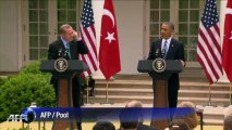 Le Premier ministre turc Recep Tayyip Erdogan a rencontré Barack Obama à la Maison Blanche le 16 mai 2013. Les deux dirigeants ont parlé de la situation en Syrie. "Nous sommes tous les deux d'accords sur le fait qu'Assad doit partir" a expliqué Barack Obama. Durée: 01:12.